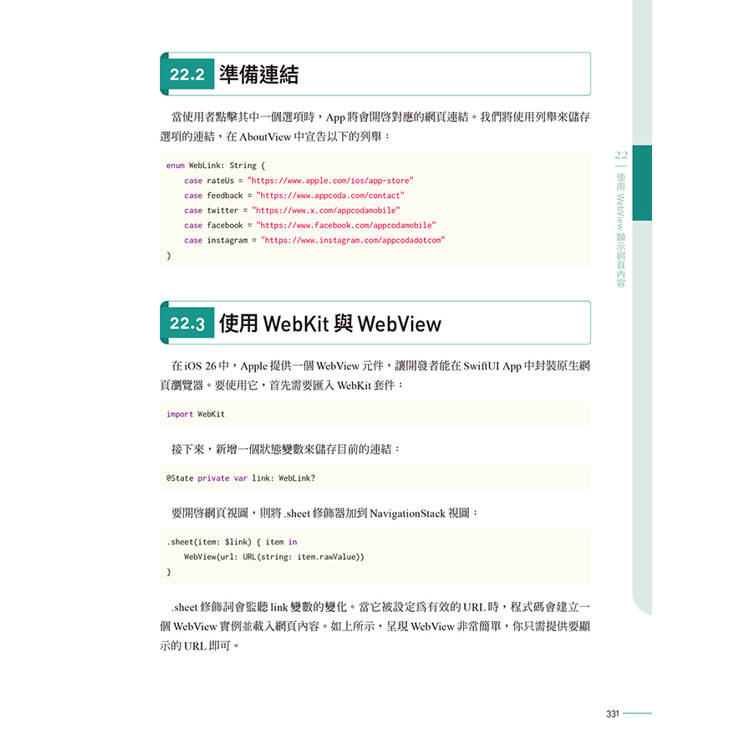 本書首先介紹Swift語言的觀念,再教導你使用Swift與SwiftUI建立你的第一個App,然後你會學到規劃App的原型,並且本書每一章中會針對iOS開發的各個面向提供提示、技巧以及許多需要親手操作的作業,最後你可以從無到有來開發出一個真正的App。本書也會教導你如何使用Xcode來佈局使用者介面,並熟悉iOS 26 SDK的基本API,跟著本書的內容學習,將可獲得真實開發App的體驗,且打好Swift程式語言的基礎,掌握程式開發的訣竅。