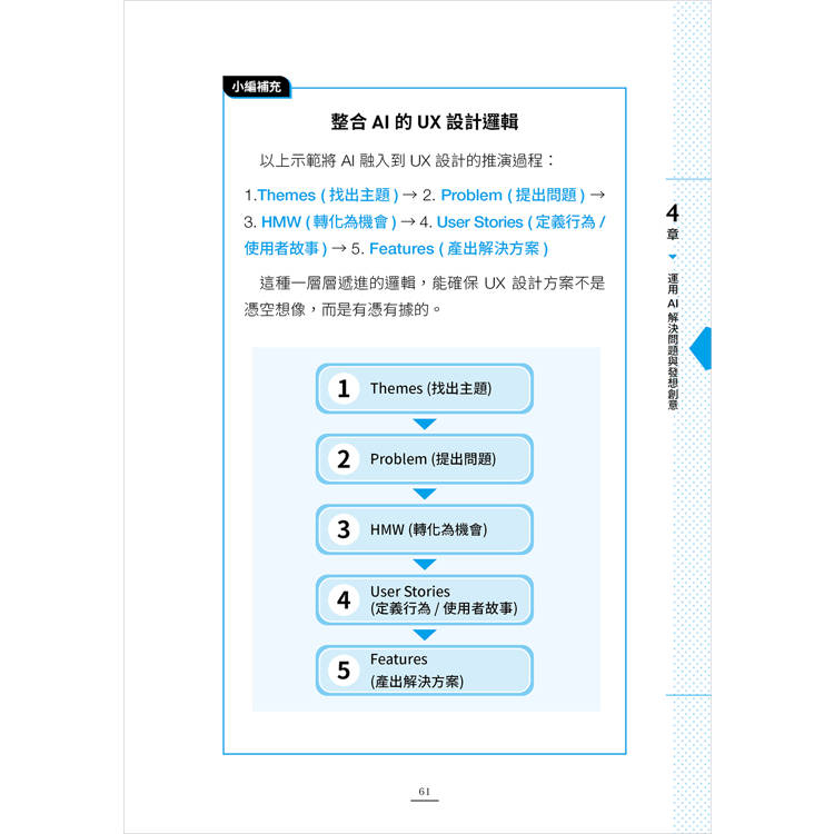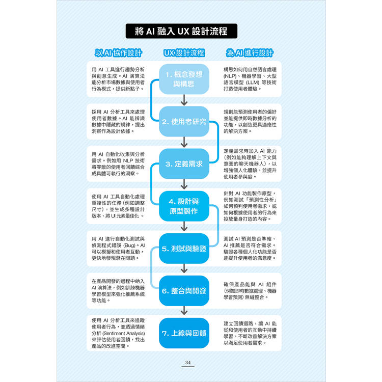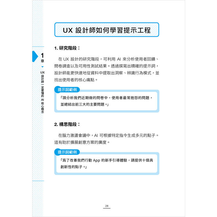 本書將引導你在以下的 UX 設計流程各階段加入 AI 輔助,善用工具與提示詞來提升工作效率,