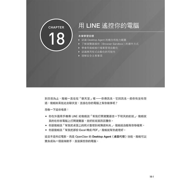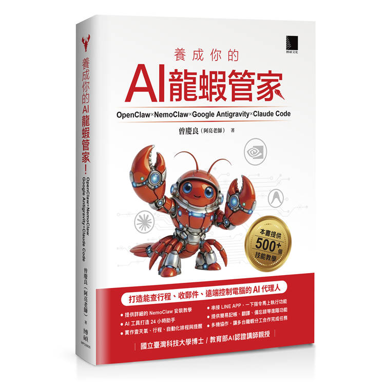 告別低效率時代,本書要教你如何從零上手 OpenClaw,並搭配 Google Antigravity 建立龍蝦的儀錶板頁面,無須自行撰寫程式碼,搭配 Claude Code 來幫你進行除錯、修改檔案、Git 操作等精準任務,最後打造出能為你執行各種任務的龍蝦,例如:查收 Email 信件/每日提醒待辦事項/翻譯/查詢火車時刻,甚至還可以設置多個龍蝦,達到更精確多工的模式。另外,本書教你安裝 NVIDIA 推出的 NemoClaw 安全增強版,打造企業級的安全強化版龍蝦。本書附錄提供完整的龍蝦安裝問題排解、模型安裝教學、龍蝦的技能清單,並針對新手和開發者提供適合的模型與成本挑選建議。
