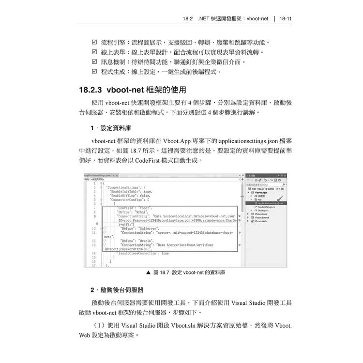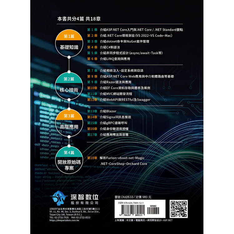 第4 篇:開放原始碼專案。本篇詳細剖析ASP.NET Core 的5 個最流行的熱門開放原始碼框架:Furion、vboot-net、Magic.NET、CoreShop、Orchard Core。系統解析這些開放原始碼框架的作用、特點、功能,並帶領讀者親身體驗其具體設定及使用過程,為讀者實際開發ASP.NET Core 專案提供借鏡模板。