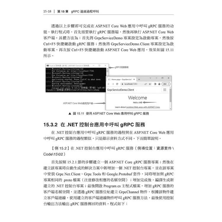第3 篇:高階應用。本篇介紹使用Blazor 建構應用、SignalR 伺服器端訊息推送、gRPC 遠端過程呼叫、身份驗證和授權、ASP.NET Core 應用釋出部署等內容。學習完本篇,讀者能夠為ASP.NET Core 應用增加Blazor 元件以及伺服器端訊息推送、遠端過程呼叫、身份驗證授權等高階功能,還可以將開發完成的應用釋出部署到伺服器上。