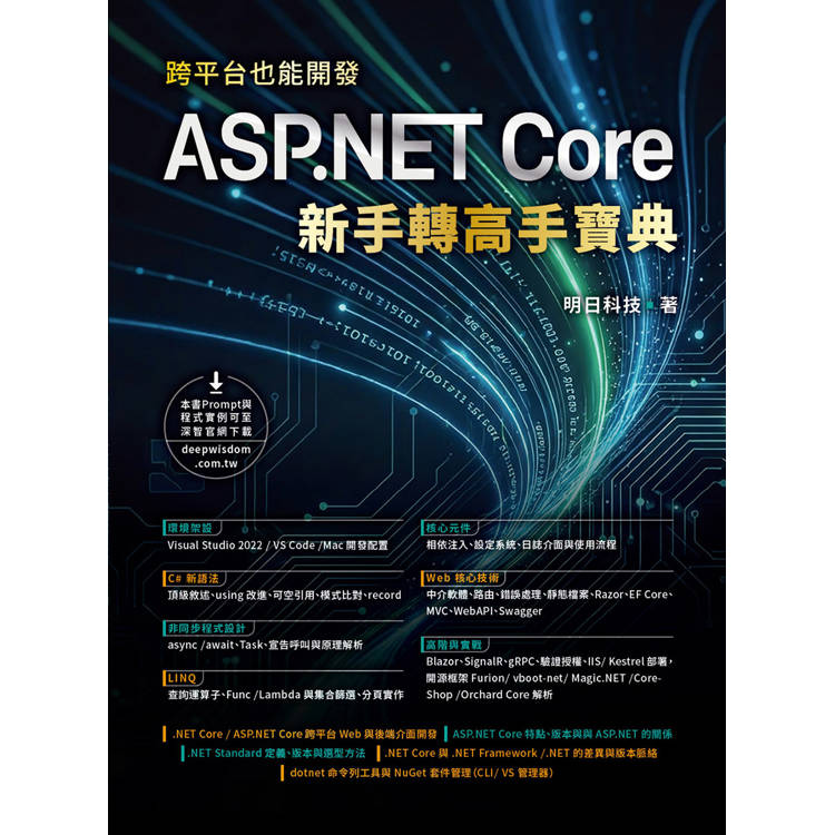 本書以.NET Core與ASP.NET Core為主軸,將網路資料分散、難以系統學習的內容整理成完整路徑,從入門概念、環境架設、dotnet命令與NuGet套件管理、C#新語法、非同步與LINQ開始,逐步進入相依注入、設定系統與日誌等核心元件,再延伸到Web應用專案結構、中介軟體、路由、錯誤處理、靜態檔案、Razor、EF Core資料存取與遷移、MVC網站與WebAPI(含Swagger)等主線技能;進一步補上Blazor、SignalR、gRPC、身份驗證授權與釋出部署(IIS、Kestrel),並以5個熱門開放原始碼框架作專案級解析,適合.NET Core技術同好、ASP.NET轉換者與Web開發者按篇章循序實作。
