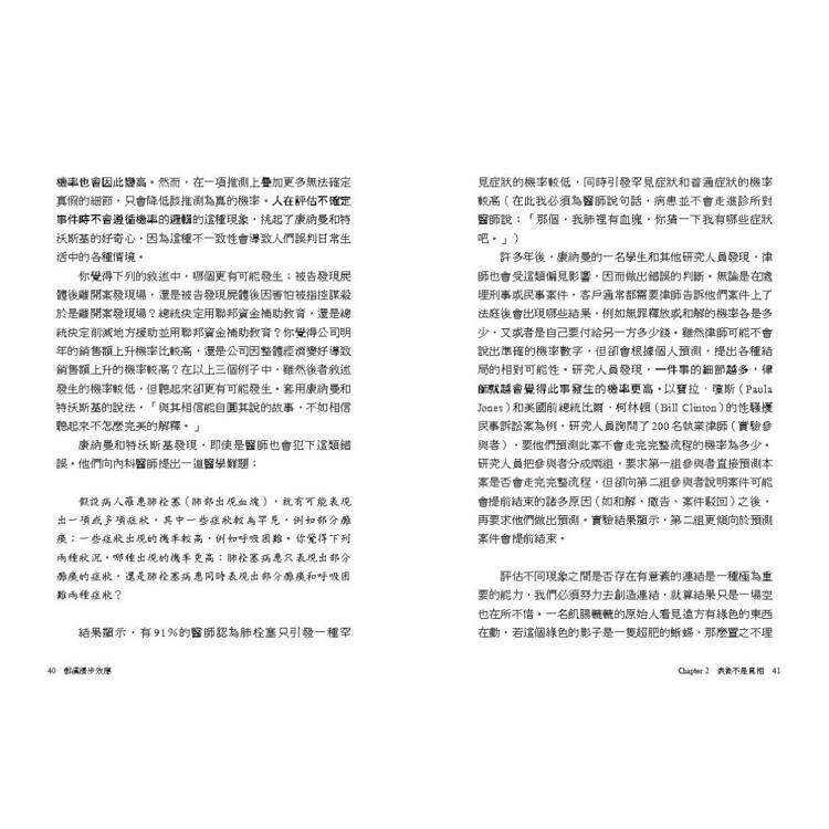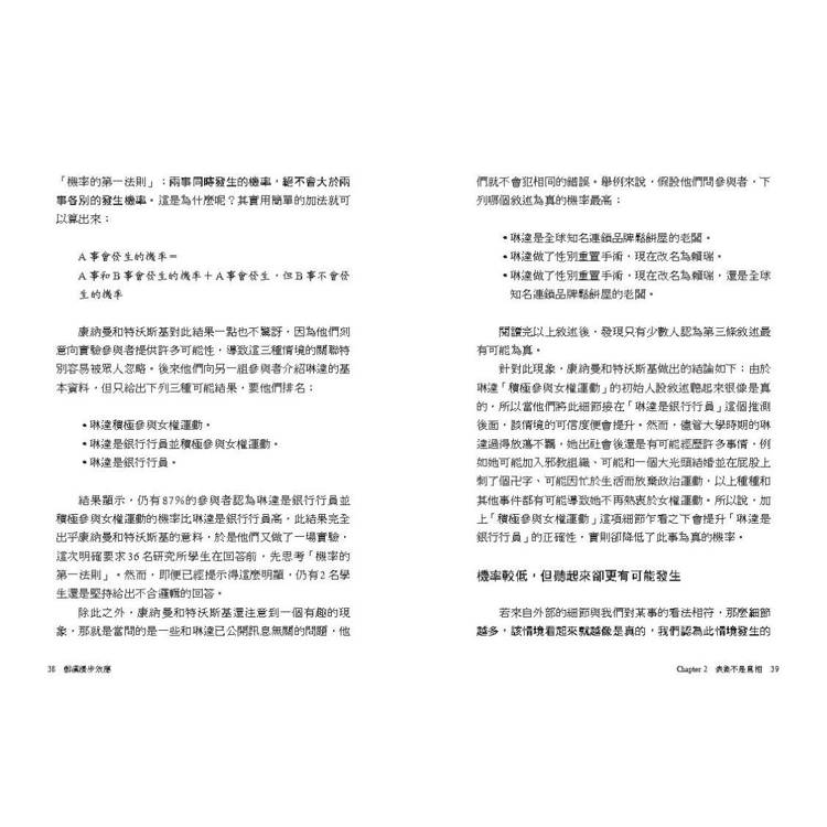 在幾年前,有一名男子在用一張尾號48的彩券贏得西班牙國家彩券頭獎後,自豪地向所有人講述自己的「成功」祕訣,他說:「我連續7個晚上都夢到7這個數字,而7×7=48。」假如你有把九九乘法表背熟的話,一定會因他的錯誤而忍不住偷笑,但其實你我都和這位幸運兒沒兩樣,我們對世間萬物都有一套自己的看法,也會利用這個觀點去過濾和處理自身感知,並嘗試在如潮水般無窮無盡的資訊中領悟涵義。在這個過程中,我們會犯很多的錯,雖然這些錯誤不像「7×7=48」這麼明顯,但造成的影響卻不容小覷。