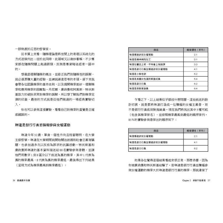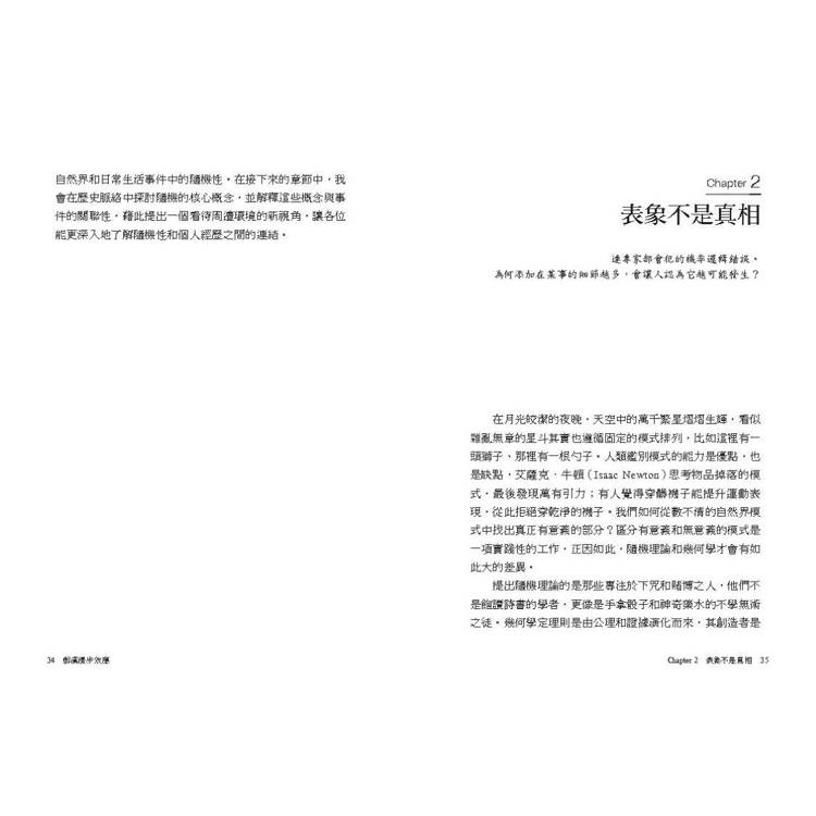 「醉漢漫步效應」(The Drunkard’s Walk)是數學界用來描述隨機動作的詞語,例如分子在太空中飛行時會不斷被其他分子撞擊,或是撞擊其他分子,導致路徑改變。醉漢漫步效應猶如人生的隱喻,象徵我們從學校到職場、從單身到成家、從高爾夫球一號球洞到十八號球洞的路徑。我們可以透過一些工具去理解醉漢漫步效應的邏輯,並利用相同的工具分析日常生活中發生的大小事。本書的目標是闡明機率在生活中扮演的角色,並告訴各位看清它如何在人類的生活當中產生作用。我由衷希望在全面認識隨機的概念後,各位讀者會開始從不同的角度看待生活,並對這個世界有更深層的理解。