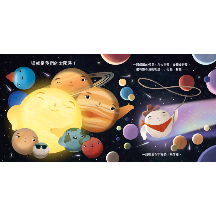 讓我們跟著這位調皮可愛的太空旅行者--牛仔彗星,開啟一段精采的太陽系之旅!你將認識一顆令人嘆為觀止的恆星、八顆獨特的行星、幾顆矮行星,以及數不清的衛星、小行星和彗星。
