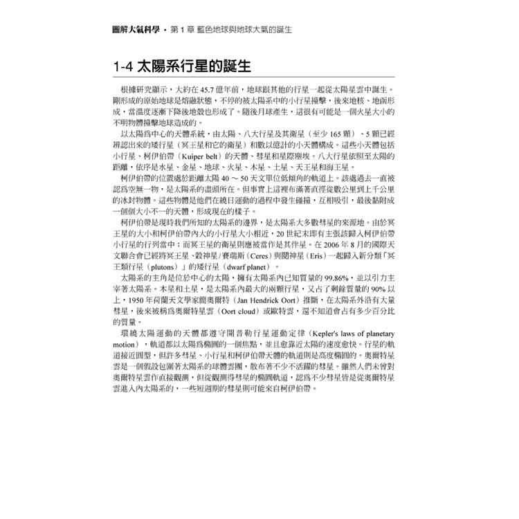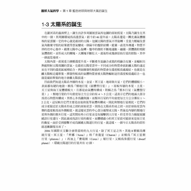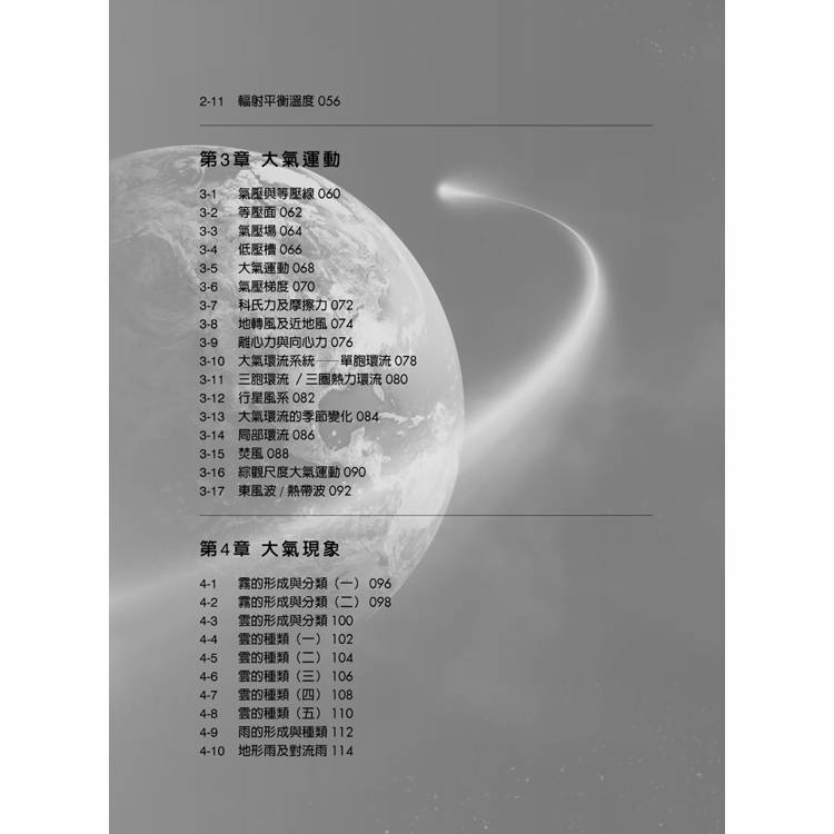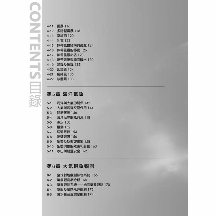 接著第8章從大氣化學著手,探討人為對環境的破壞,包括化學煙霧與臭氧層減弱的傷害;第9至第10章從認識氣候學到探討氣候異常情形與發生原因;最後在第11章介紹大氣科學應用,如航空運輸、太空科學與軍事氣象之應用等,是大氣科學研究和經濟建設的重要組成。讀者瞭解大氣科學的特性後,即可發現它的多樣性,依照興趣都能在大氣科學中找到適合自己才能的研究方向,讓自己在這個充滿挑戰的領域中發光發熱。