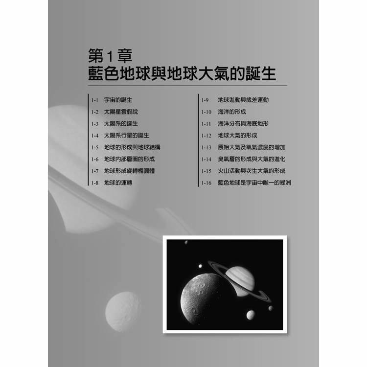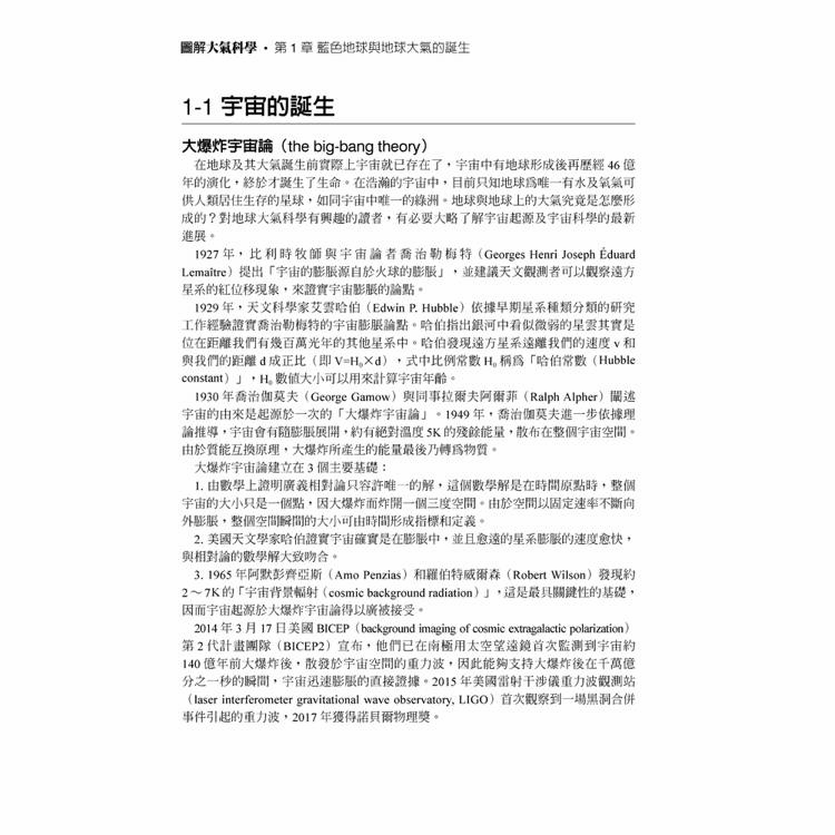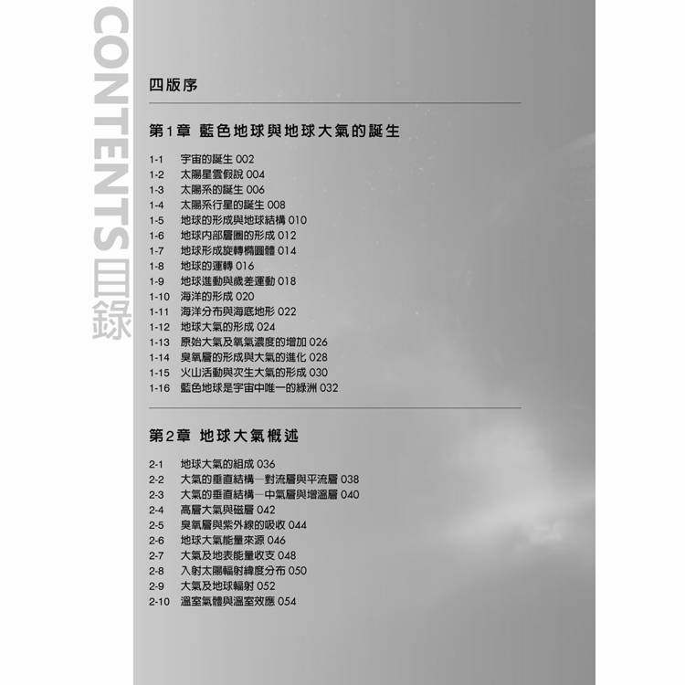 第1章描述宇宙誕生及地球大氣的形成;第2至第5章敘述地球大氣的結構、運動與大氣現象,如熱帶風暴、龍捲風及聖嬰現象等。第6章介紹大氣觀測系統與氣象要素之觀測。第7章簡述如何分析與預報天氣,包括數值天氣預報,讓讀者了解近代大氣科學作業的整體輪廓。