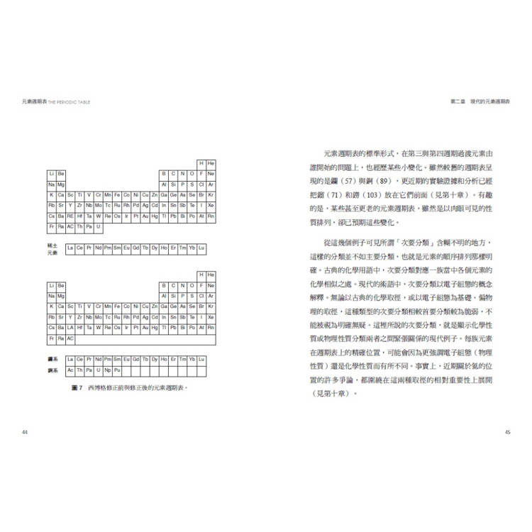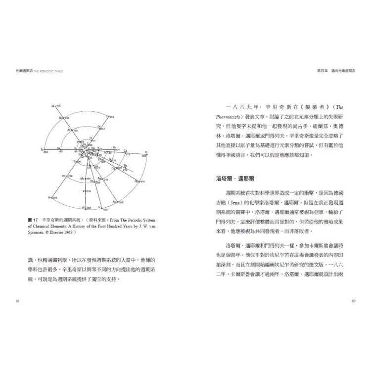 自門得列夫發表週期表後,一百五十多年來有許多人撰文介紹化學領域中最具代表性的系統。然而,唯有艾瑞克‧希瑞能以如此簡明扼要的方式,介紹元素週期表的來源、意義與最新發展。