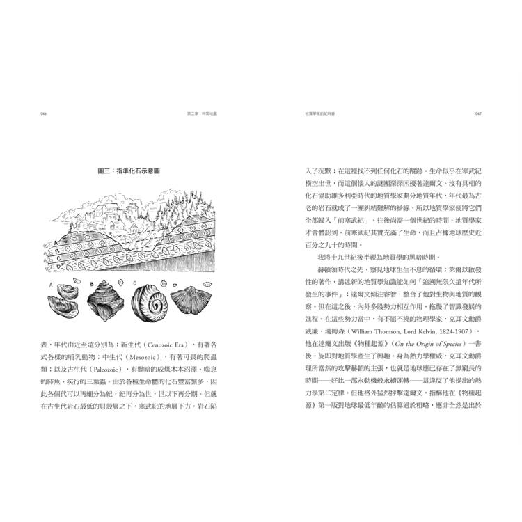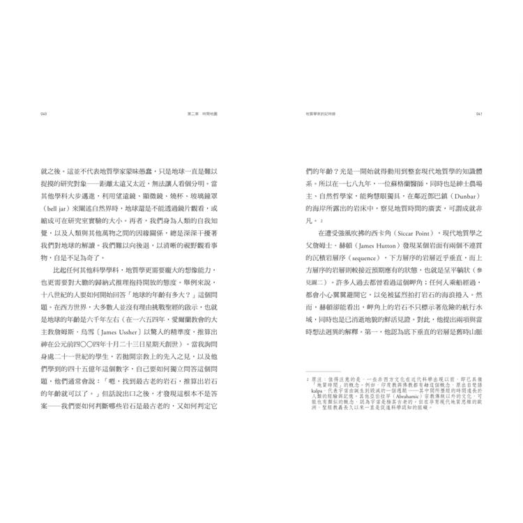作者貝約內魯地質學教授用清晰委婉的文辭闡述數百年來人類對時間的概念,從十八世紀對創世紀時間(十七世紀愛爾蘭大主教詹姆斯.烏雪提出創世時間公元前四○○四年十月二十三日星期天)的辯證開始,到二十世紀初同位素定年法發現後,於一九五六年美國地質學家帕特森利用鈾鉛定年法確定地球年齡為四十五.七億年時,才解出自赫頓時代以來,眾地質學家與物理家長久尋覓不得的終極答案。