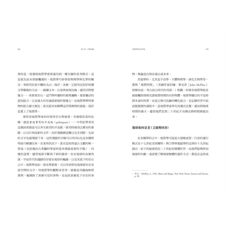 地質學科宛如一部光學裝置,可以用來照見地球留存在各度空間的文字。用地質學的觀點來思考,就像是用腦海映照萬物,範圍除了表層可見的事物,也包括表層底下存在的事物,無論是出現在過去或未來。
