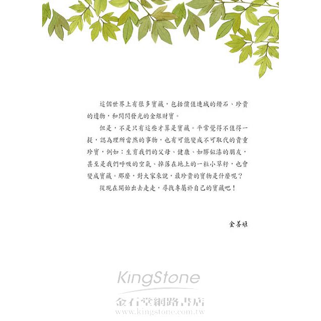 但是,不是只有這些才算是寶藏。平常覺得不值得一提,認為理所當然的事物,也有可能變成不可取代的貴重珍寶,例如:生育我們的父母、健康、如膠似漆的朋友,甚至是我們呼吸的空氣、掉落在地上的一粒小草籽,也會變成寶藏。那麼,對大家來說,最珍貴的寶物是什麼呢?