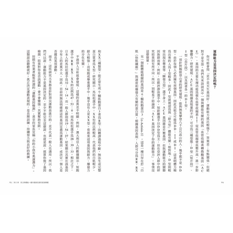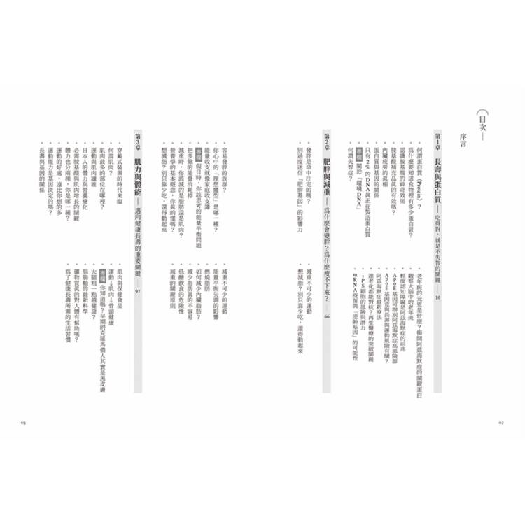 穿戴式裝置的時代來臨/何謂肌肉?/肌肉最多的部位在哪裡?/運動與肌肉纖維/日本人的體力與營養變化/必需胺基酸與肌肉增長的關鍵/體力也分兩種,你是哪一種?/運動的好處,遠比你想的多/運動能力真的由基因決定嗎?/長壽與基因的關係/肌肉與保健食品/運動↓肌肉↓骨頭健康/專欄 你知道嗎?早期的克羅馬儂人其實是黑皮膚/大腿粗一點越健康?/腦腸軸的最新科學/礦物質真的對人體有幫助嗎?/為了健康長壽所需的生活習慣