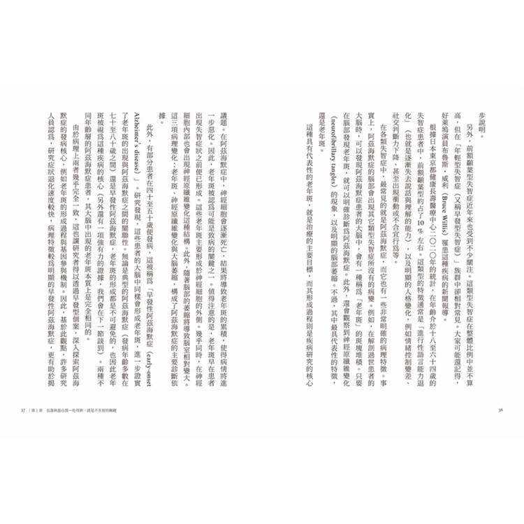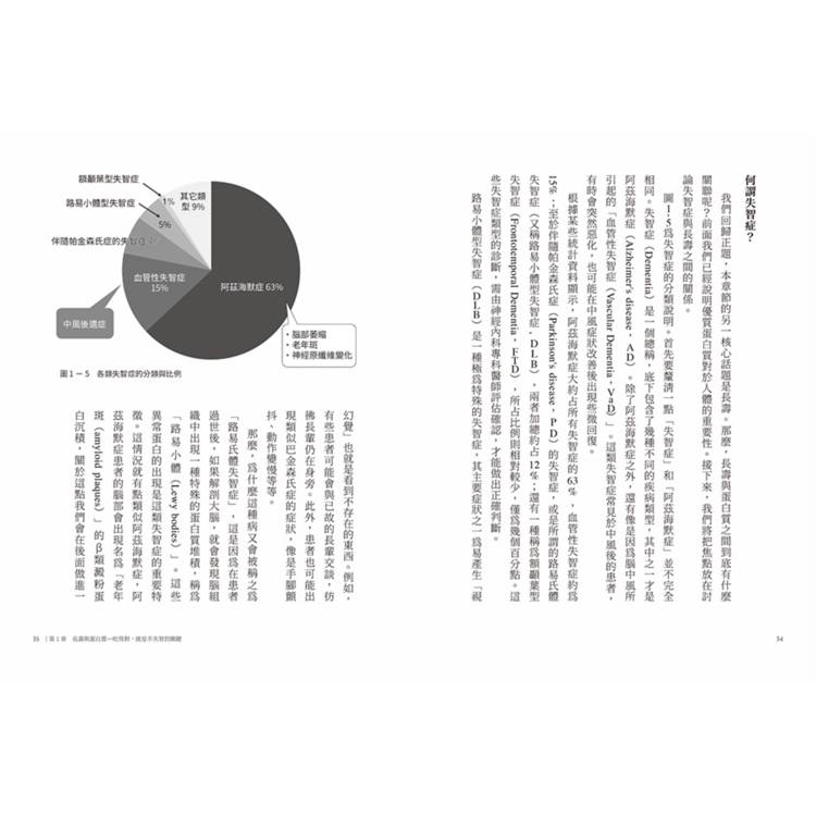 第1章主要探討蛋白質與老化的關聯。從談論為了不依賴他人照護,理解攝取蛋白質必須持續一輩子及鍛鍊肌肉的必要性,延伸至蛋白質異常所引起的失智症(Dementia)。這部分正是我的專長領域,所以我也會談及有關治療阿茲海默症(Alzheimer's disease)的新藥物。