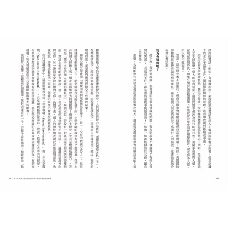 觀察大腦/窺探他人的內心/調控大腦活動/不可為的非人道腦部操控/智力會遺傳嗎?/孩子的能力是怎麼決定的?/大腦改造/現實的討論/能否將基因導入人體?/用「刺激大腦」來治療疾病?/專欄 班傑明·利貝特的奇妙實驗