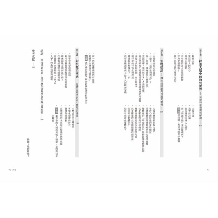 血液檢查揭示的資訊/什麼是「血液生物標記」?/安潔莉娜・裘莉與 BRCA 基因突變/癌症從哪來?/非侵入式疾病預測,有可能嗎?/期待中的行為生物標記/健康監測科技的下一步/從呼氣檢測疾病/大腦結構能預測智力嗎?/尋找心理狀態的生物標記/探討憂鬱症與營養補充品的科學根據/憂鬱症的「單胺假說」/抗憂鬱藥物與作用機制/憂鬱症藥物的現況與更多可能/抗憂鬱藥的效果與隱藏的副作用/如何判定憂鬱症?/如何有效避免憂鬱症?/新一代抗憂鬱藥物的可能性/憂鬱症治療為何這麼難?/專欄 迷幻藥治憂鬱?解密新興療法的科學潛力