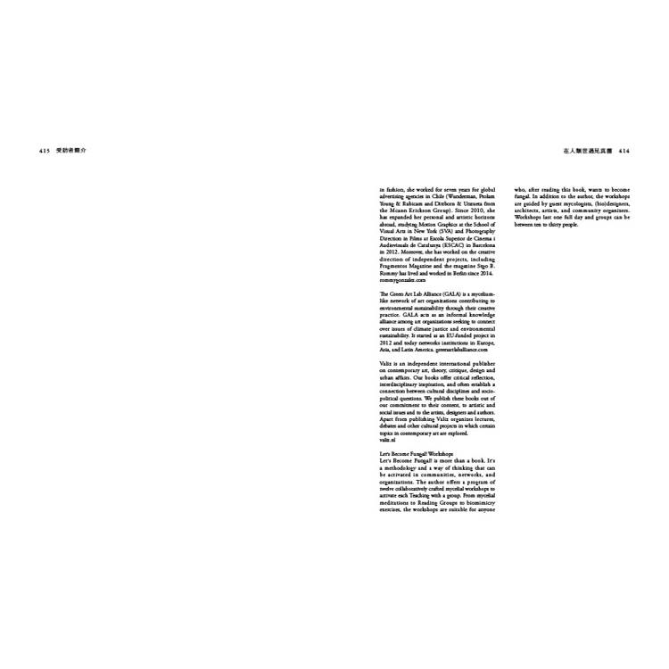 作者以藝術策展和工作坊的豐富經驗,特別設計多種學習方案與工作坊:從「菌絲冥想」到讀書小組,從仿生練習到跨學科對話、野外採集⋯⋯邀請讀者體驗「真菌化」過程,並將真菌的教誨真正「激活」到社群與組織中。