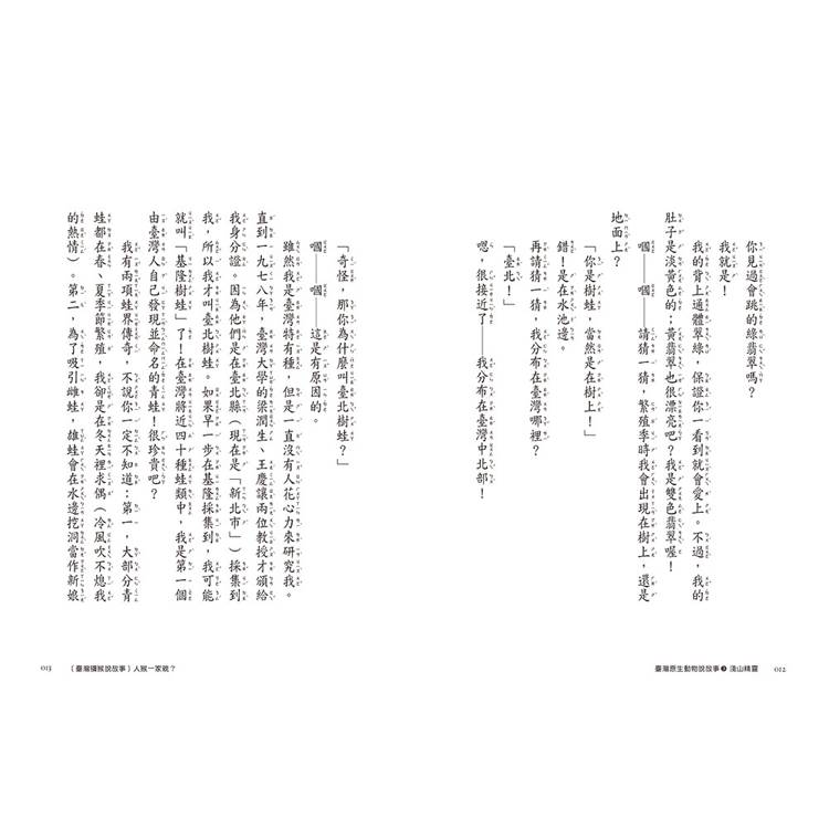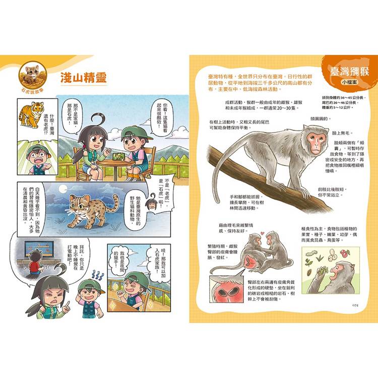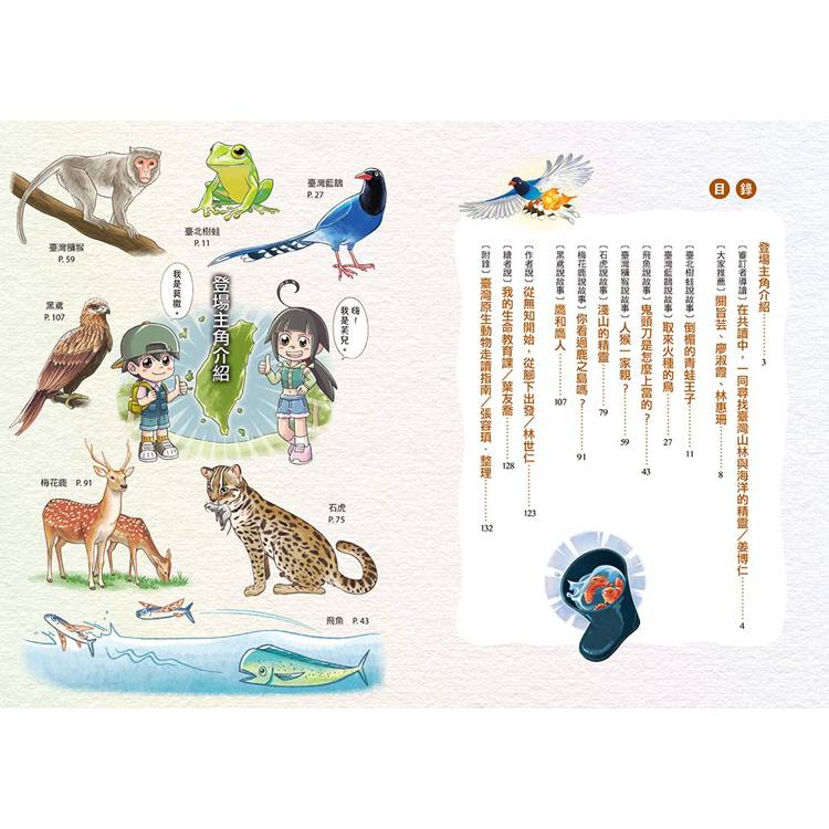 這一冊,帶大家認識原生動物中鄰近人類生活圈的七種生物,包括:臺灣獼猴、臺灣藍鵲、飛魚、臺北樹蛙、石虎、梅花鹿、黑鳶等。