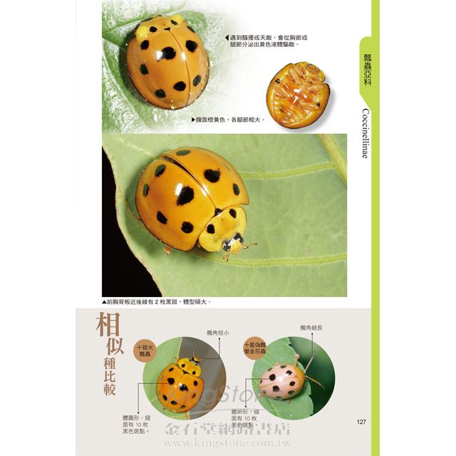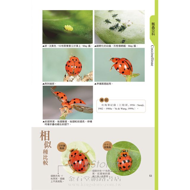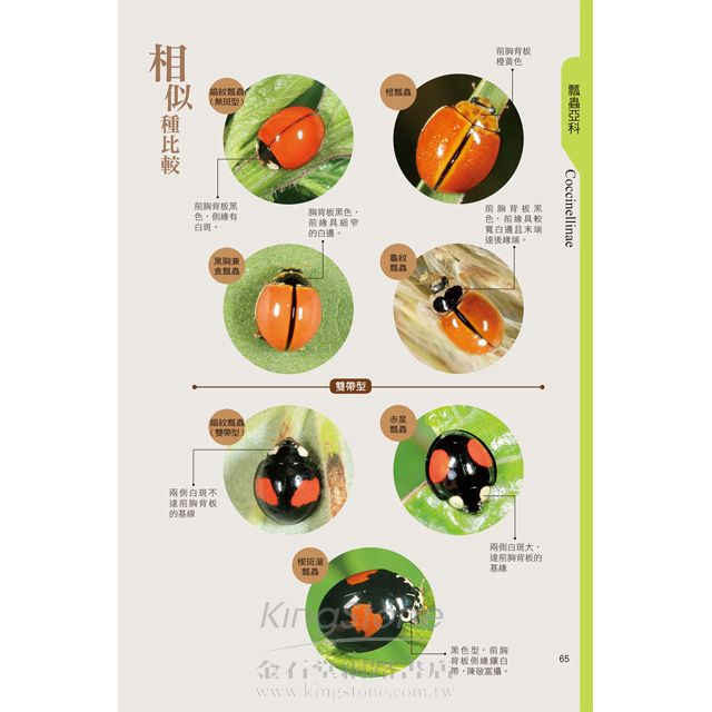 瓢蟲斑紋多變、不僅同種瓢蟲有多種變化外,有時不同種又有相近斑紋,透過本書的圖片比較,讓您輕鬆辨別其差異。