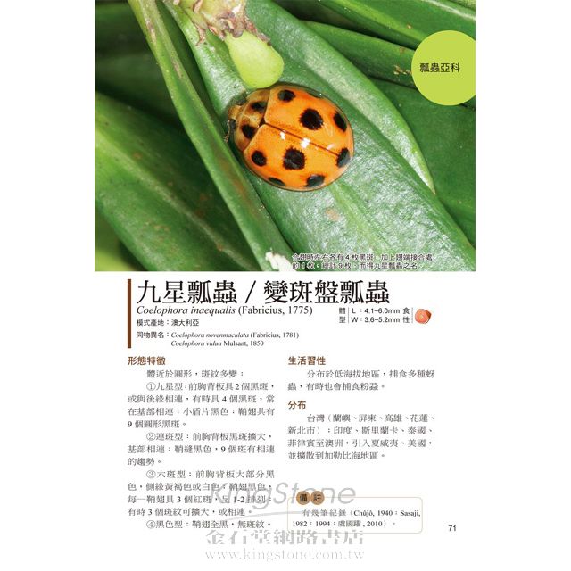 收錄台灣常見、稀有種瓢蟲,包含1個新種和4個台灣新記錄種,詳細的形態特徵、生活史、習性介紹,是您認識瓢蟲的最佳工具書。
