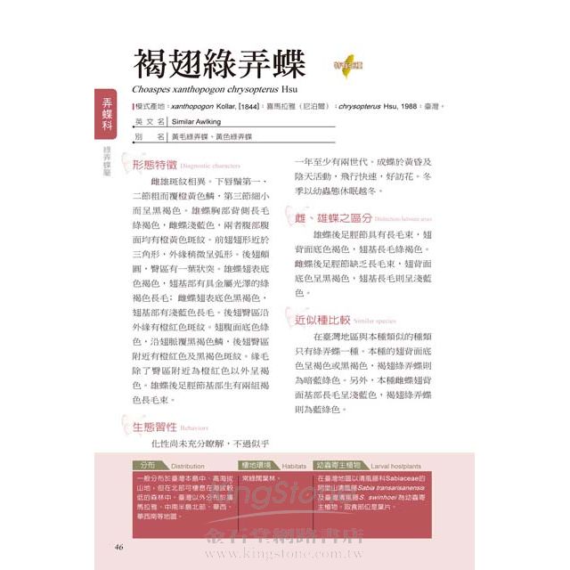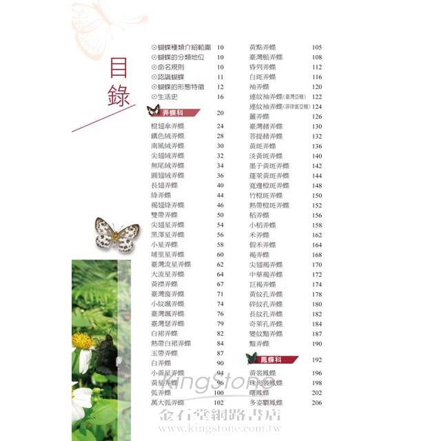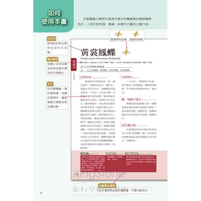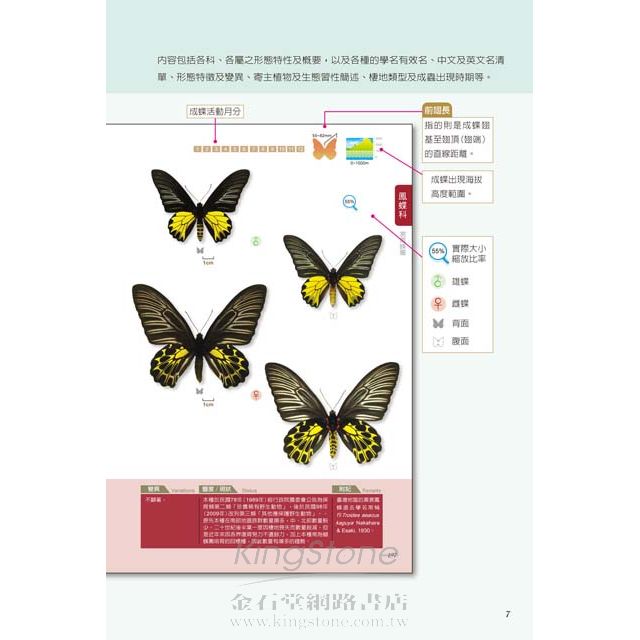 依據科屬分類編排,詳細介紹各蝶種形態特徵、生態習性、分布、雌雄區分、相似種比較及變異說明等資訊。