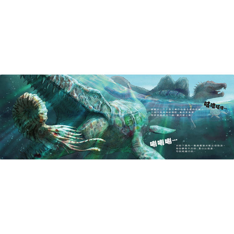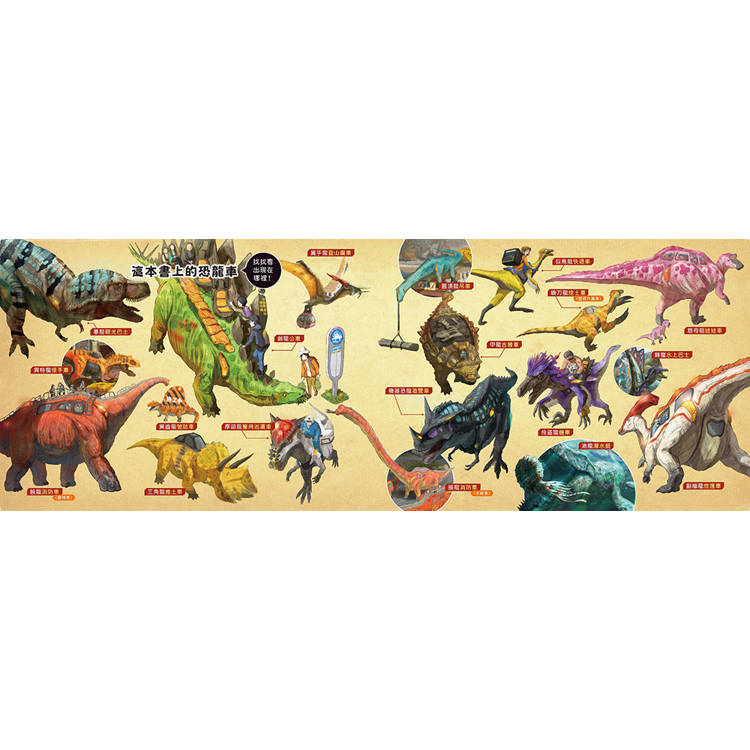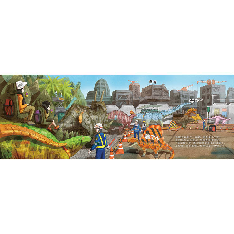 一路上轉乘棘龍水上巴士、搭上振翅高飛的無齒翼龍纜車,前往神祕的恐龍山。沿途驚喜不斷:工地裡有三角龍推土車忙碌工作,腕龍消防車趕去火災現場,還看到伶盜龍飆車被厚頭龍警車追捕!