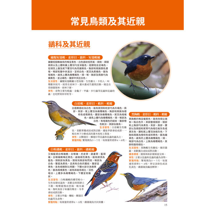 為了讓讀者能對鳥類有清楚的認識,本書特選159種鳴禽、30種走禽、47種游禽、60種涉禽、42種猛禽、39種攀禽加以介紹,內容包括鳥類的基本介紹、繁殖生態、棲息地與食性等。內容精采實用,插圖精美。透過數千張高解析度大圖,讓你輕鬆辨識與欣賞,適合廣大鳥類愛好者鑑賞和收藏,讓你輕鬆觀鳥、識鳥與賞鳥,帶你走進不一樣的鳥類王國。