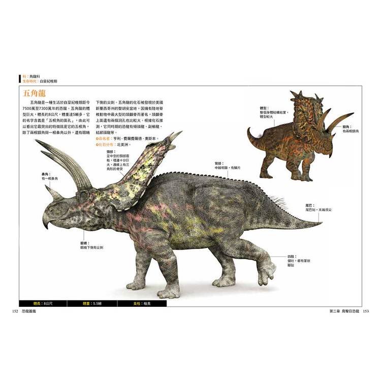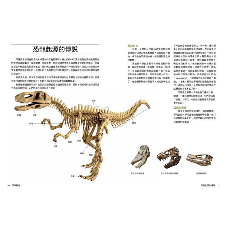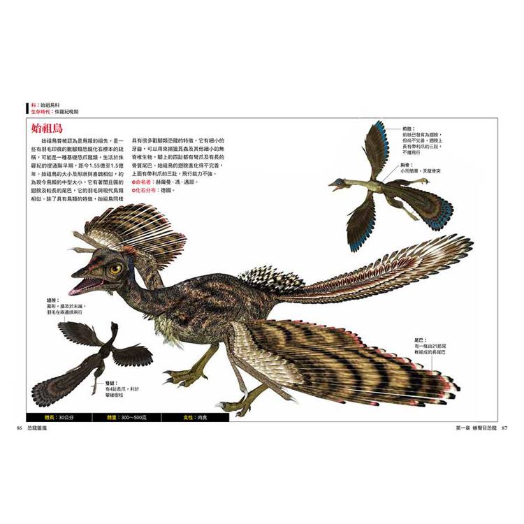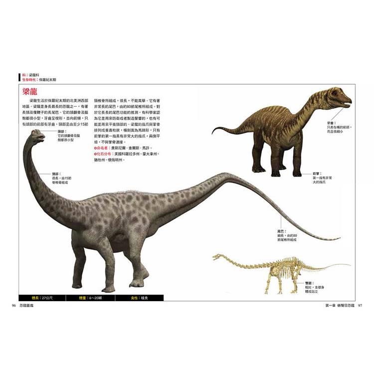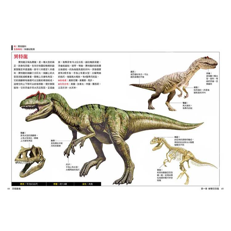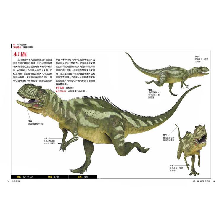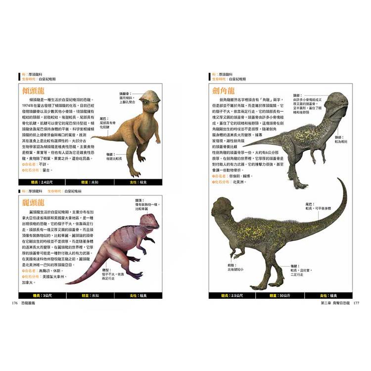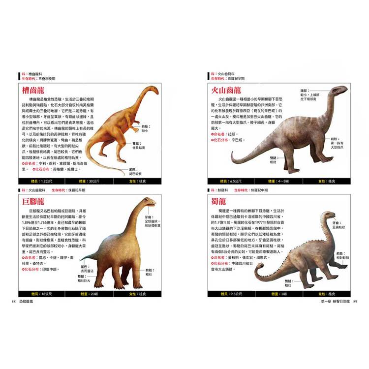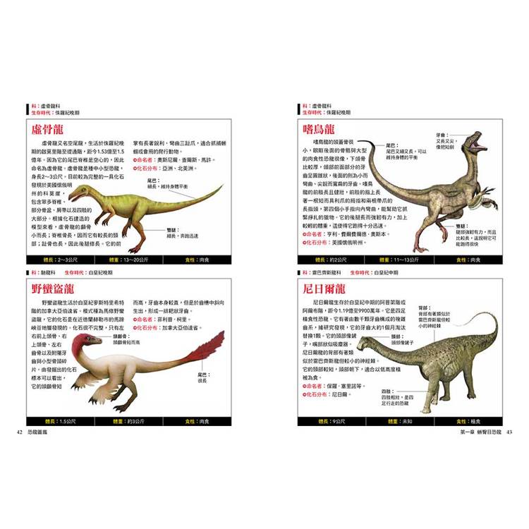 每種恐龍都標示中文學名、拉丁文意、生存年代、身體構造與部位圖解、化石分布與命名者、體長體重與食性、科學研究補充(如羽毛證據、群居行為、狩獵推測)。