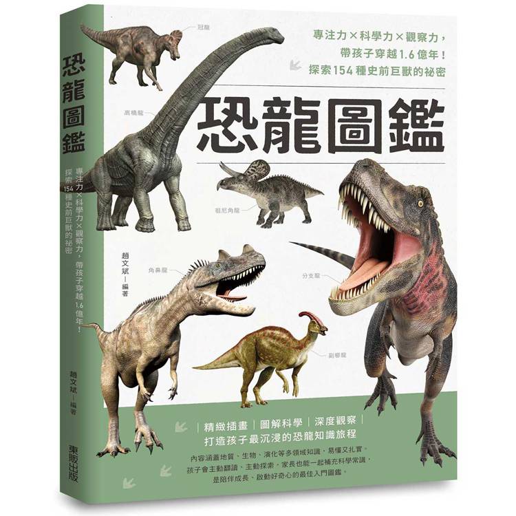 想像孩子翻開書頁的那一瞬間,彷彿穿越時空,踏入恐龍稱霸的侏羅紀與白堊紀。書中精選 154 種已正式命名的恐龍,從威武的暴龍到優雅的梁龍,從具羽毛痕跡的始祖鳥到全身披甲的甲龍,每一種都以高清彩色插圖、生動特徵圖解與照片完整呈現。