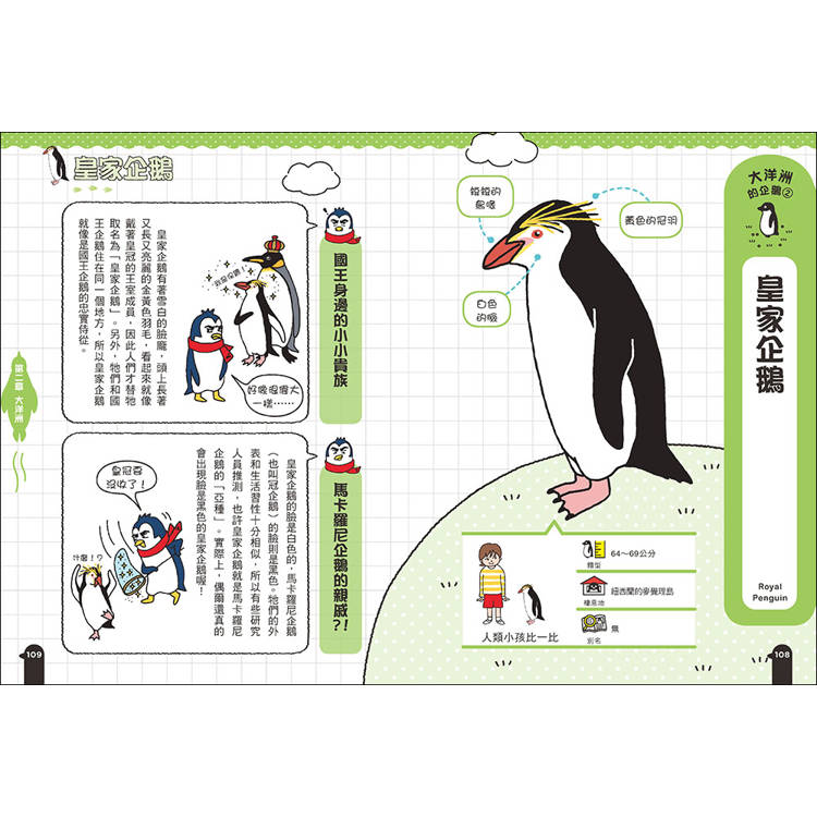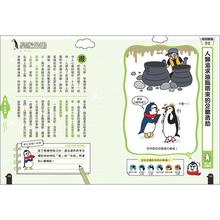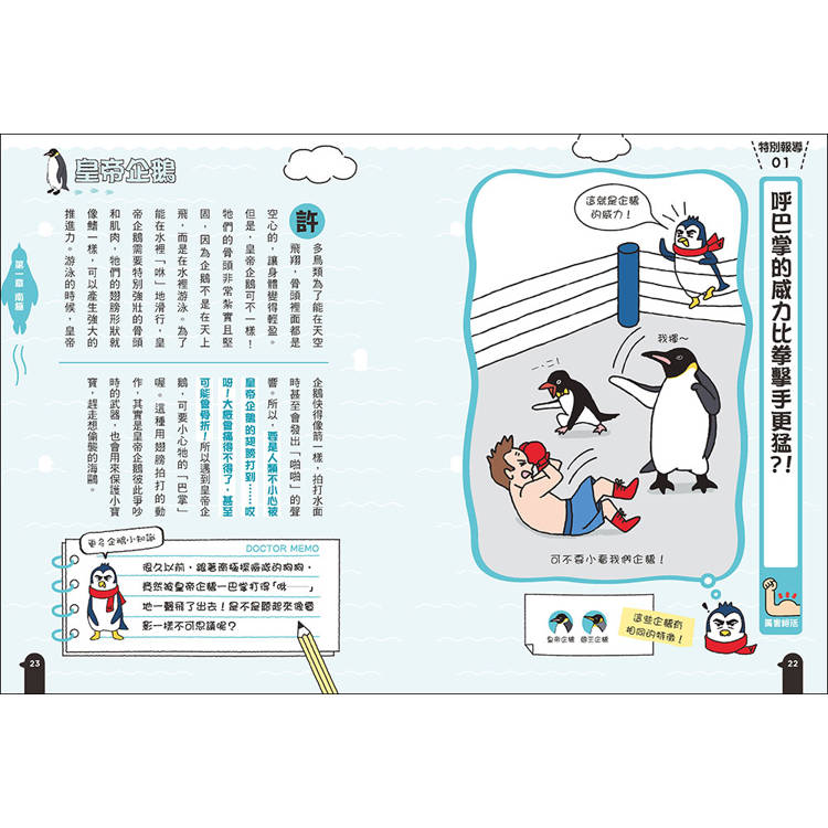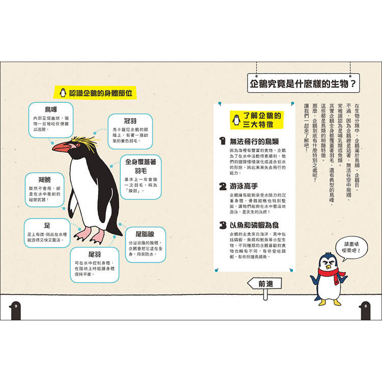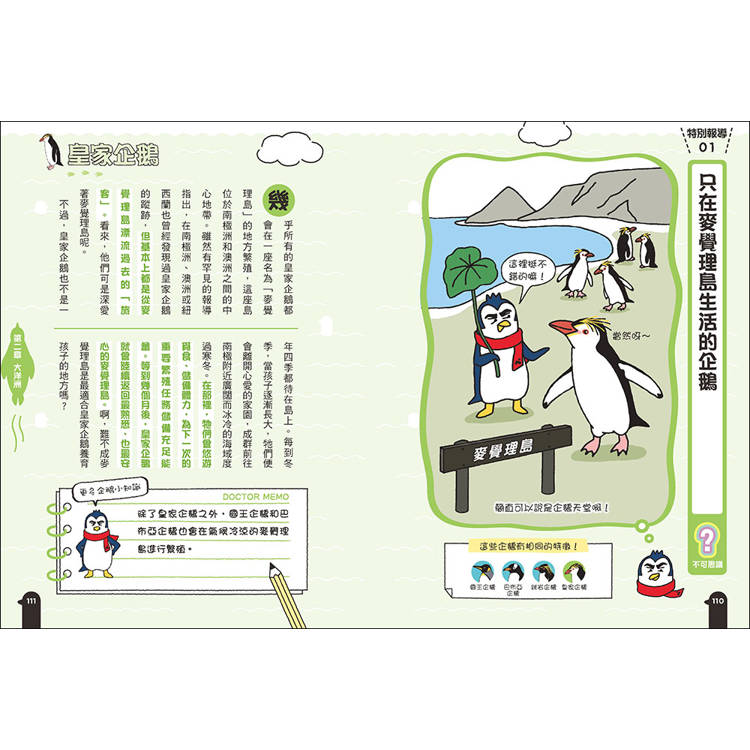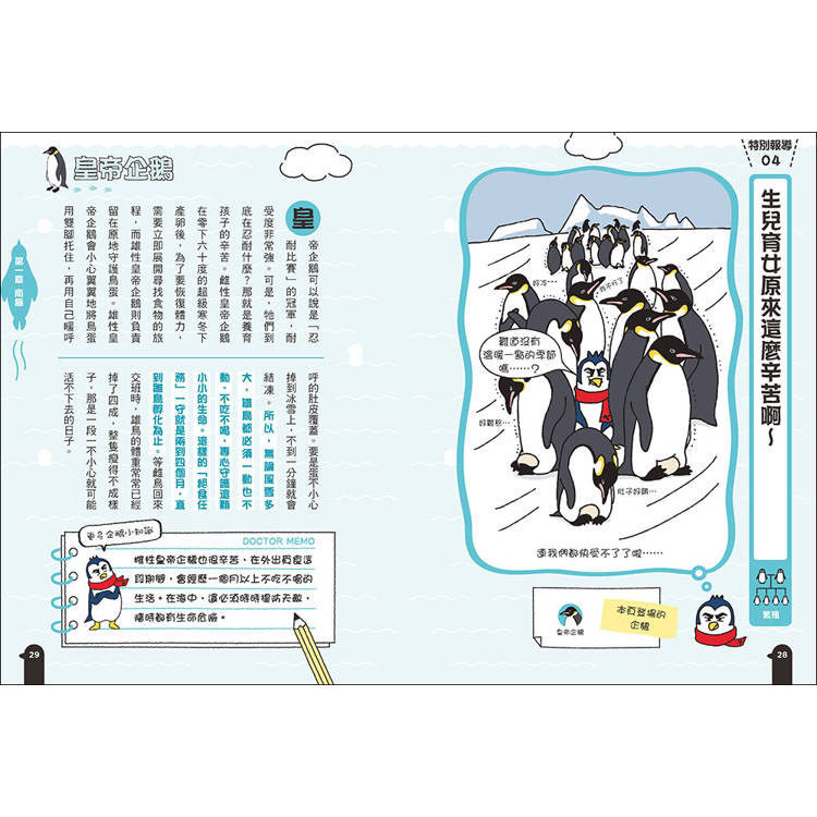 為什麼皇帝企鵝能分泌「企鵝奶」?巴布亞企鵝的名字竟然和「巴布亞新幾內亞」有關?顎帶企鵝的便便可以噴到1.3公尺遠!每個章節都有讓人眼睛一亮的小祕密。