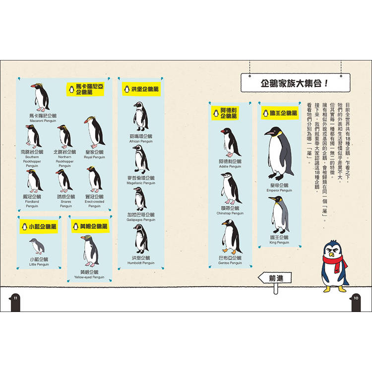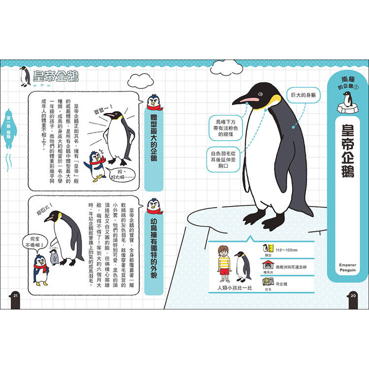從皇帝企鵝、國王企鵝到小藍企鵝,完整蒐羅世界上現存18種企鵝品種,搭配詳細解說與精美插圖,孩子一眼就能看出不同企鵝的外貌、大小與生活習性。