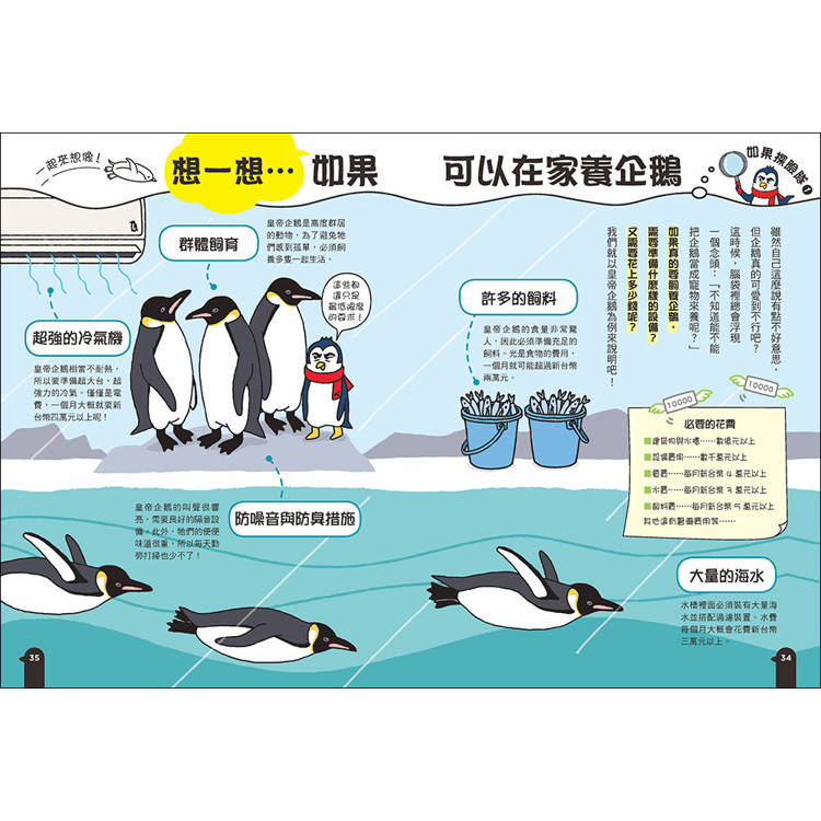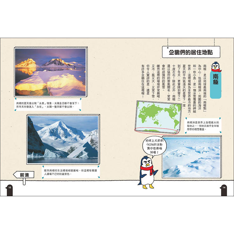 書中特別規劃「人類小孩比一比」、「更多企鵝小知識」、「如果探險隊」等專欄,引導孩子主動投入,讓孩子能邊看邊想像,提升閱讀的參與感。
