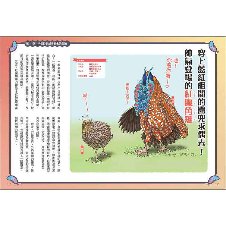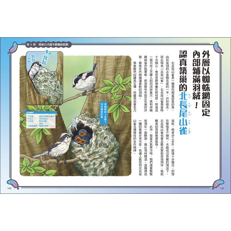 從外貌怪到爆、脾氣差到誇張、求偶方式像表演舞台劇,到擁有超厲害技能的鳥類,全書依照「外表」「生態」「技能」「求偶」「築巢」分成五大類,讓孩子與大人一目了然。