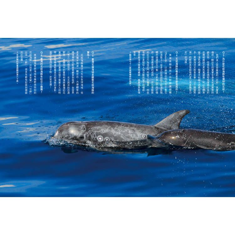 第二本書則以在花蓮港賞鯨目擊占比排名第二的花紋海豚為主角,不僅因為花紋海豚可能是很多人第一次賞鯨觀察到的種類,更是因為牠們以身體做為日記本,將生命經歷的傷痕與成就都以花紋圖騰累積在身上,逐漸豐富花白的圖騰是個體的生命紀錄,也讓我們可以進一步瞭解花紋海豚與鯨豚、與環境、與威脅的關係。