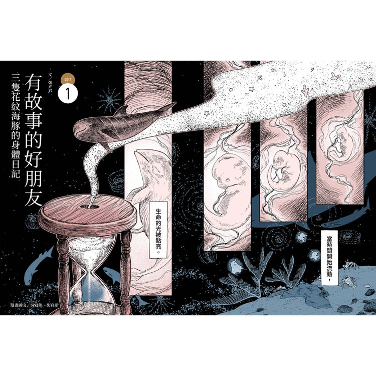 這是臺灣首部結合花紋海豚與動物福利議題的科普書,從封面開始即以插畫呈現故事感,開場以15個QA搭配跨頁鯨豚影像,快速掌握主角與議題;內文四大篇章透過情境插圖、主文故事、圖表漫畫、議題解析,深入花紋海豚的世界,並逐步探討動物福利科學的科普知識及國內外發展趨勢,期待與鯨豚一起從陸地上的「樂園」游向共生的海洋「家園」。
