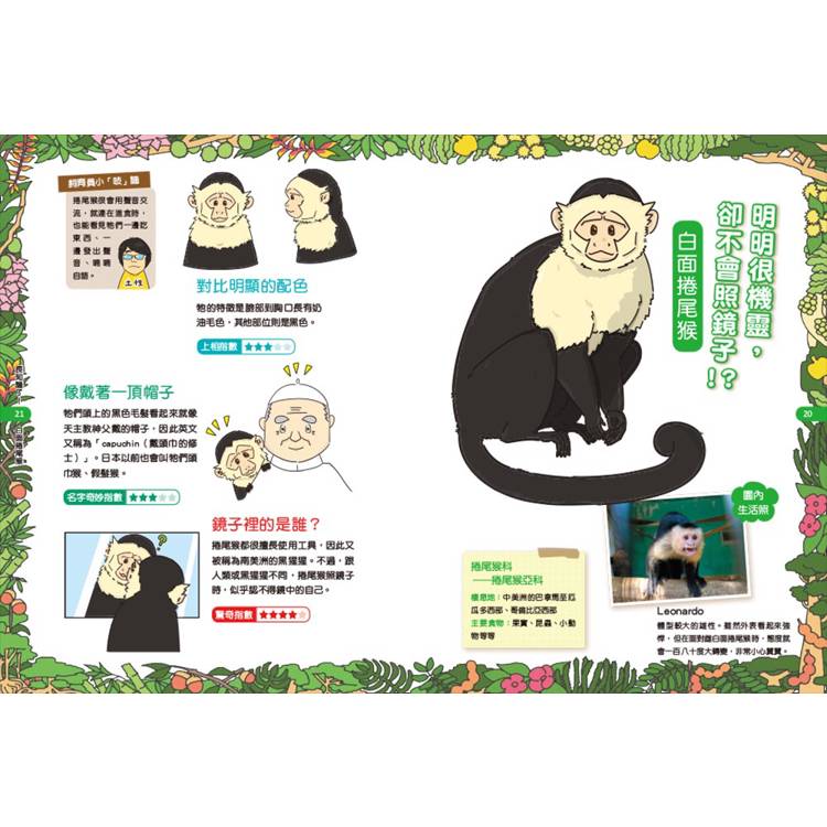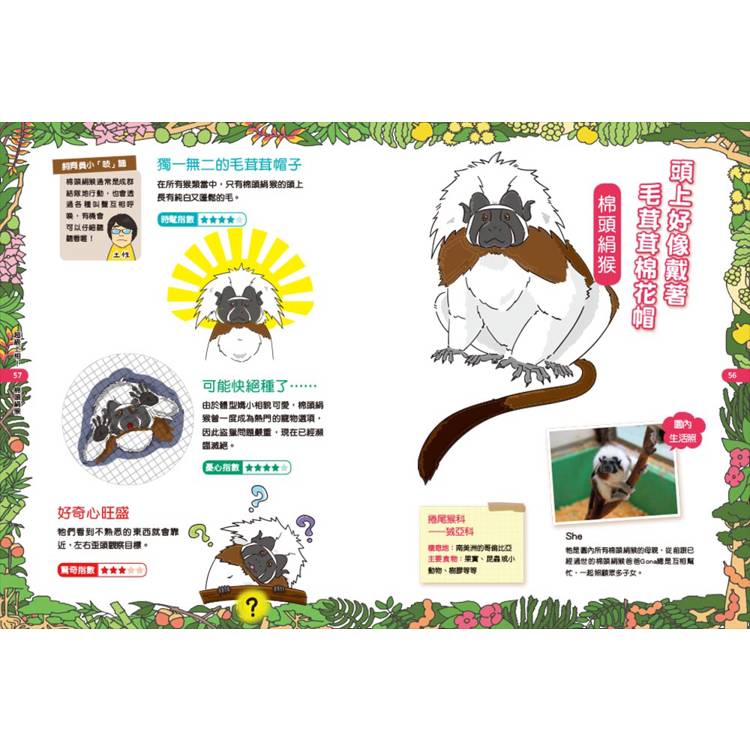 猿猴的世界,精彩得超乎想像!有的行為特殊,每天必須高歌一曲、會拿麵包當餌捕魚;也有的造型吸睛,留著山羊鬍造型、鼻子是一顆愛心……本書將從習性、長相、口味、相處模式到性特徵,以六大主題帶你認識多樣化的猿猴生態。