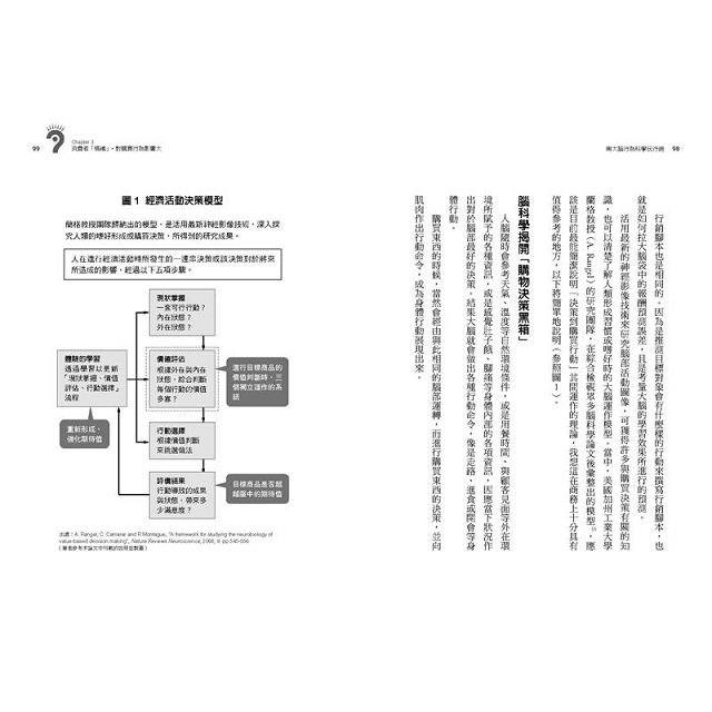 其他諸如「得失認知偏差」,是決定售價和消費者「預測報酬」的重要機制,而大腦有三大價值評估系統,會在「決策黑箱」中互相影響,商品要有人氣、要長紅不敗,就要同時滿足這三大系統。