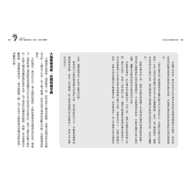 而且,人在做決策時,會參考腦中天生擁有的「本能資訊」,以及透過學習或經驗等形成的「後天資訊」來進行決策,而並非從腦中所有的資訊挑選出最理想者,這一點和我們平常使用的電腦是截然不同的──電腦會先搜尋一遍所有資訊,嘗試各種組合以找出最適合的解答。但如果人類一樣這麼做的話,很可能早上起床後到晚上入睡前什麼事情都做不了。