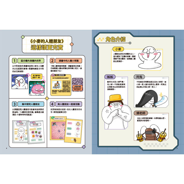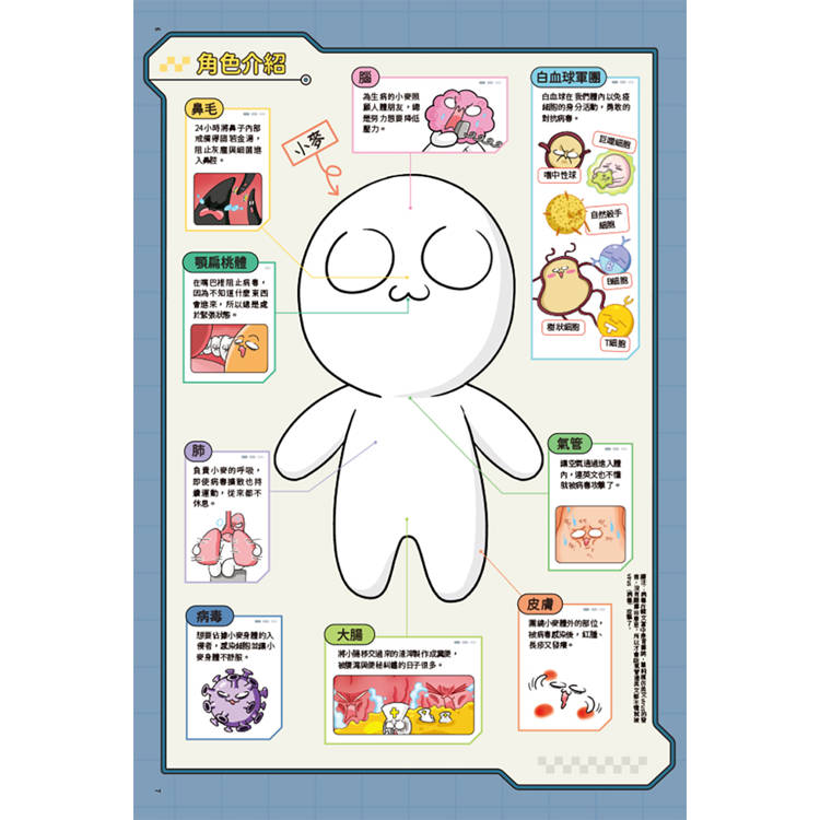 本書結合漫畫劇情、擬人化角色、人體知識補充單元與活動遊戲頁,是一套能讓孩子笑著學會人體運作的STEAM知識讀物。