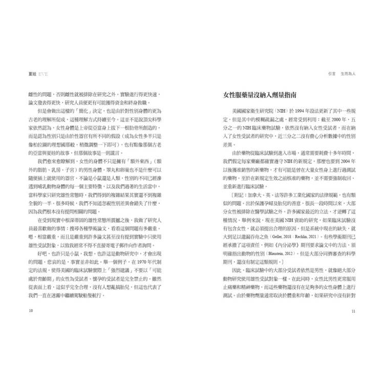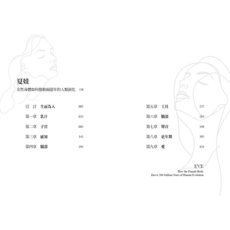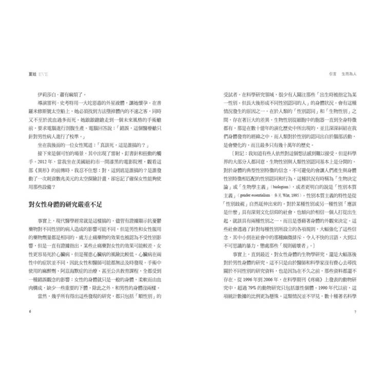 本書的內容就是那個故事。(或者說,這至少我盡全力能做到的事情,從一張可以連上大型圖書館的小桌子,加上和一小群耐心的科學家和學者,願意與我同行,讓我瞭解所有我一開始不瞭解的事情。)《夏娃》這本書追溯了女性身體從乳頭到腳趾頭的演化,以及這種演化如何影響女性今日的生活。藉由把這些演化過程整合起來,並且聯繫到最近的發現,我希望能夠針對與女性身體相關的最基本問題,提供最新答案。事實證明,這些基本問題正刺激產生出一些令人深感興奮的科學:為什麼會有月經?女性為什麼活得更長壽?為什麼女性更容易罹患阿茲海默症?為什麼女孩在青春期之前,幾乎每項學科成績都比男孩好,之後的分數卻突然下降?真的有「女性腦」這樣的東西嗎?還有,到底為什麼當女性進入更年期時,每天晚上都會造成床單汗溼?