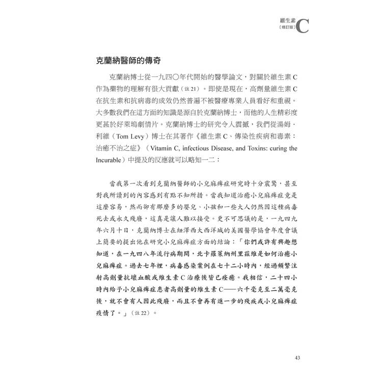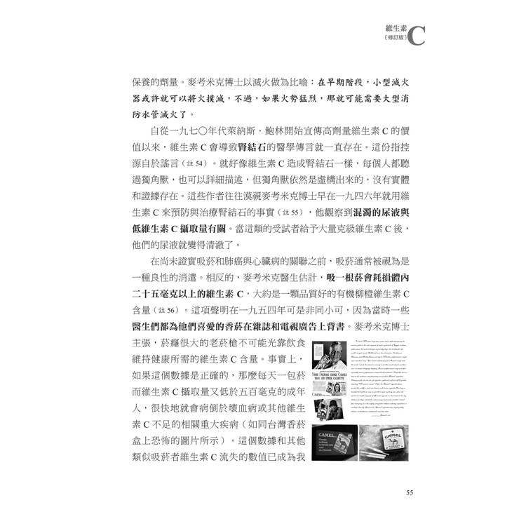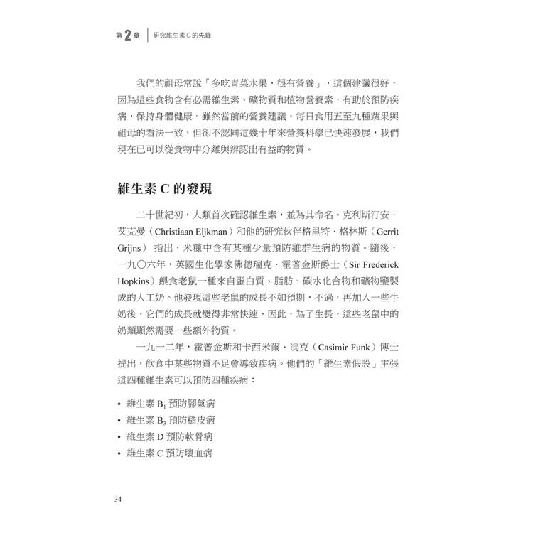 從發現維生素C、認識維生素C、解開維生素C的迷思,一一介紹推廣維生素C的先鋒與他們於時代遭遇的不白之冤。