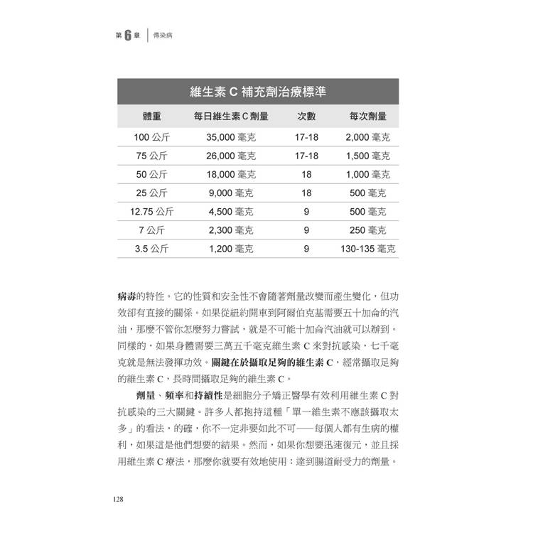 克級劑量的維生素C 可以預防許多疾病,而治療疾病則需要更高的劑量,然而,治療所需的高劑量往往受到質疑,當我們告知醫生治療感冒可能需要每日五十至一百公克(五萬∼十萬毫克)時,他們的疑點就從療效轉移到劑量的大小。大多數的臨床研究都以克劑量為單位,而大於一百倍以上的劑量就有非常不同的屬性。