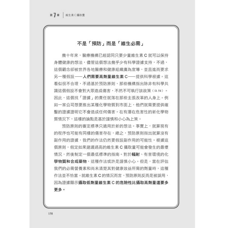維生素C 爭議的原因之一是矛盾的臨床結果,因為劑量使用不足,試驗中劑量比該給的量少一百倍,並且一再地打破藥理學的基本規則(註21)。舉例來說,想像一項給予二萬名年輕育兒期婦女服用避孕藥來避孕的研究,該研究人員想要證明這種避孕藥無效,所以他們每月只給一顆藥錠,而不是照原訂的每天一顆,對照組則每月給予一個糖錠(安慰劑)。現在,假設五年後臨床實驗結果顯示,一個月服用一顆避孕藥的懷孕率和糖錠組的結果是一樣的。任何有理智的人都不會接受「這個臨床試驗已證實服用該避孕藥無法避孕」的聲明,你不能指望每日一顆的需求量改為每月一顆後可以達到相同的效果。然而,研究「高劑量」維生素C 的作法就類似上述,目的就是要證明它無效。