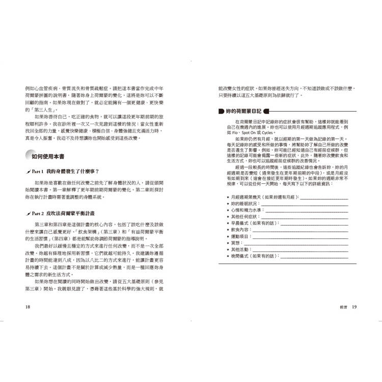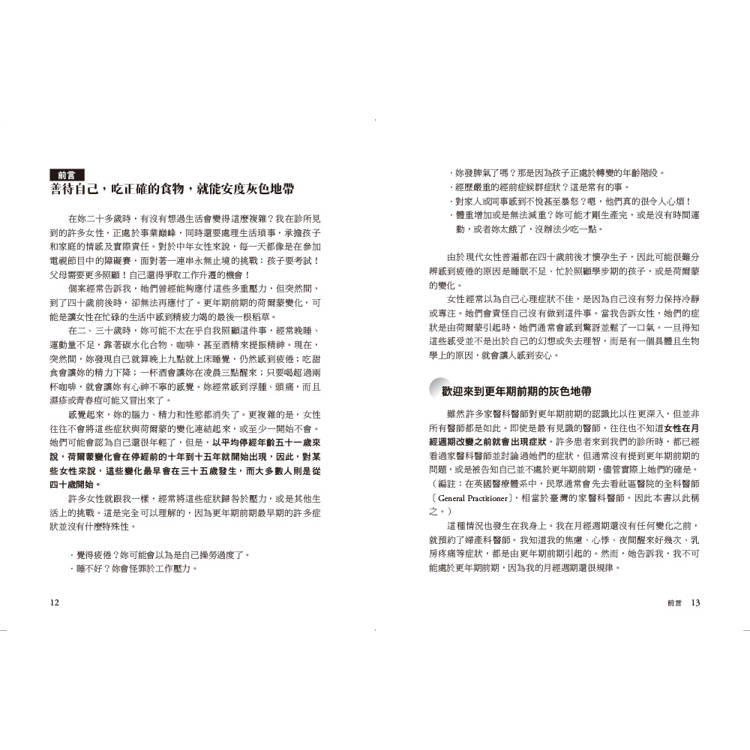 在更年期前期,女性的荷爾蒙總是在變化,相關症狀也會在幾個月和幾年內有所改變,因此這本書將是妳可以不斷回顧的指南。