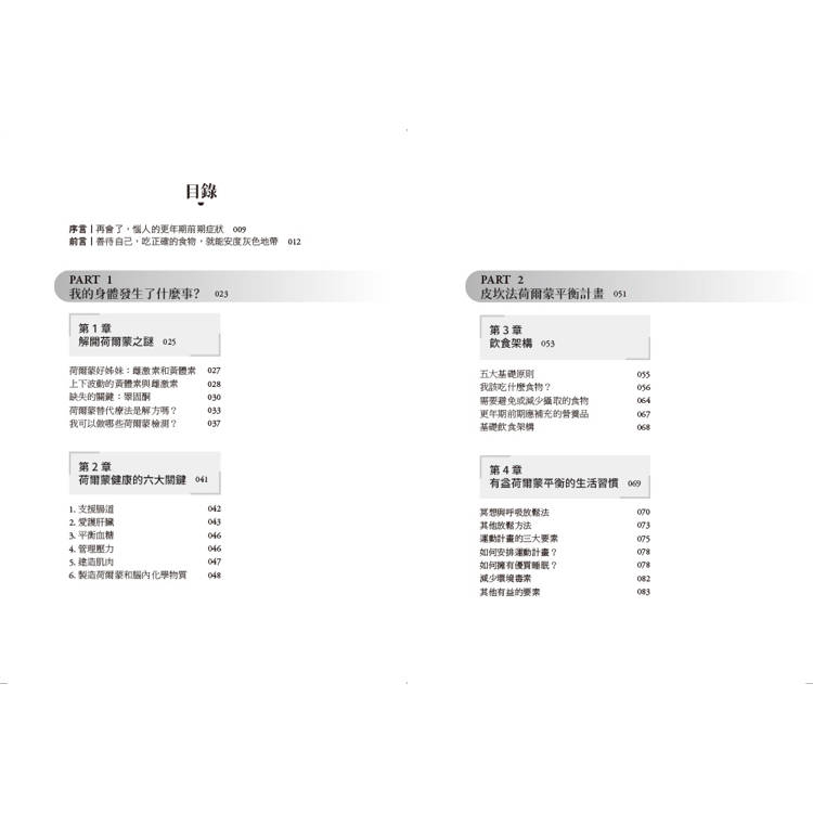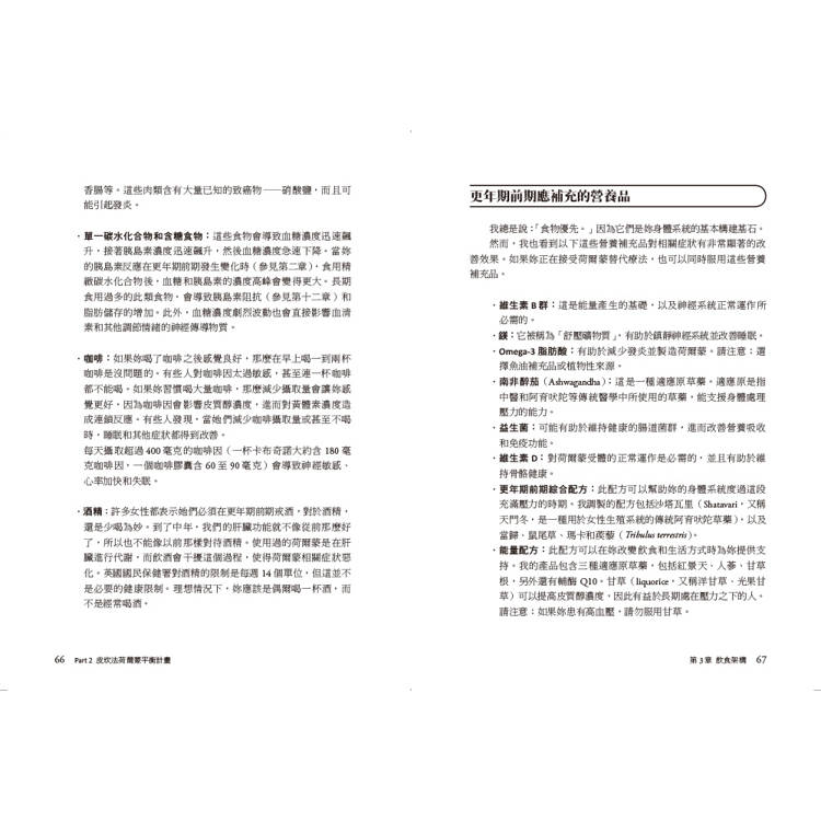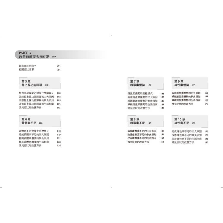 .書中羅列了症狀清單,以便讀者勾選自己出現的相關症狀,了解自己面臨哪種荷爾蒙失衡狀況,同時也詳細說明如何對症調節荷爾蒙。