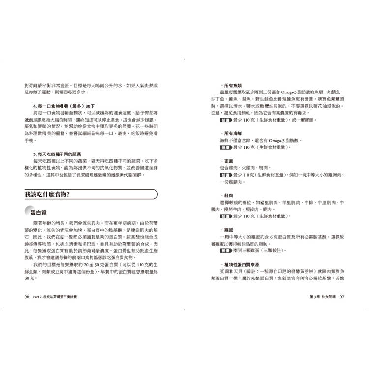 .獨家荷爾蒙平衡計畫:遵循飲食架構及其五大基礎原則,再加上有益荷爾蒙平衡的生活習慣,包含冥想與呼吸放鬆法、運動計畫、優質睡眠、減少環境毒素等。