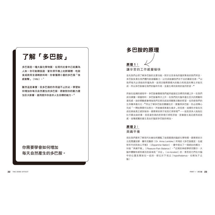 多巴胺是一種需要付出努力才能「賺取」的化學物質。以你正在閱讀本書的此刻為例,它就是與「速效多巴胺」行為完全相反的活動,閱讀被歸類為「緩效多巴胺」(slow dopamine)行為。當你打開這本書開始閱讀時,大腦不會立刻感到愉快,但是當你專心閱讀一段時間,大約五到十分鐘後,你會發現滿足感和成就感油然而生,這是因為你「賺取」了快樂。