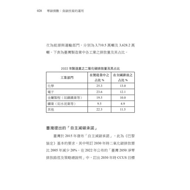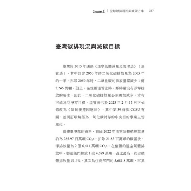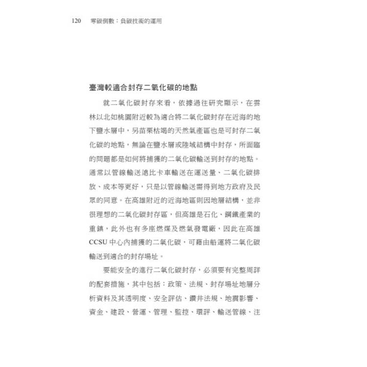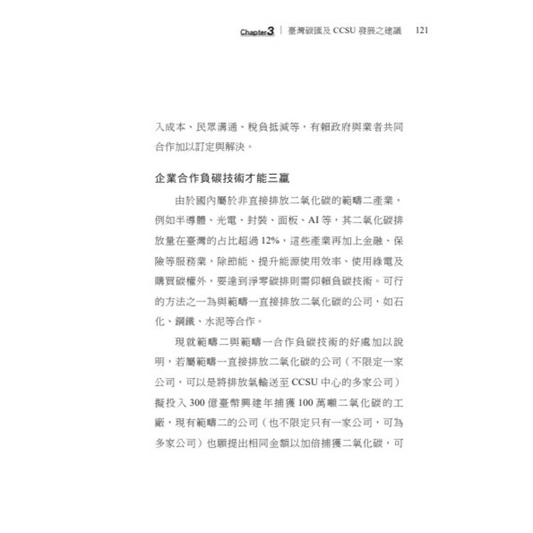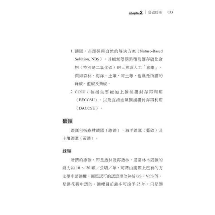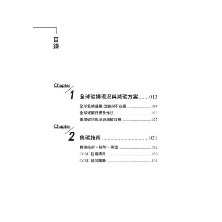 負碳技術作為減碳的主要方式之一,其技術包括碳匯與CCSU等,書內詳盡介紹碳匯的種類,如綠碳、藍碳等,而CCSU的技術項目及發展現況,更是不可錯過的議題。