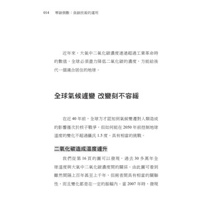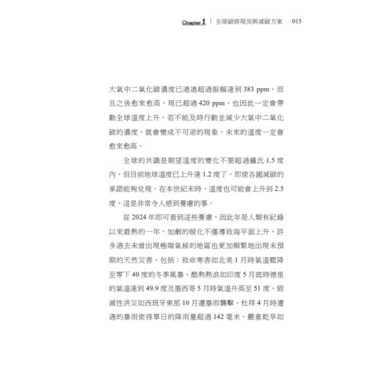 在全球進入極端氣候後,碳排已成為刻不容緩之事,書內收錄、說明目前全球發展的減碳目標及作法,並分析其優缺點、現況等,並詳盡說明臺灣的碳排現況與減碳目標。
