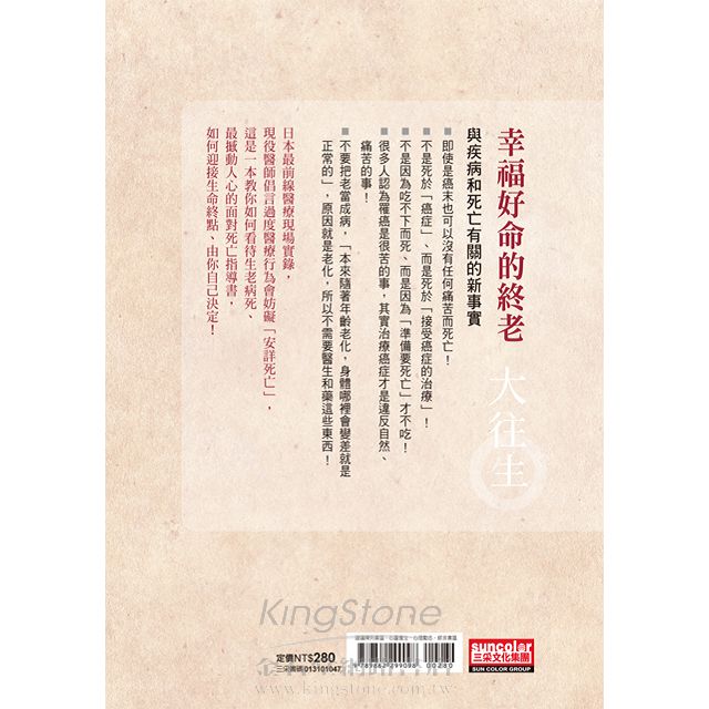 《大往生》,一個看起來讓人心驚的書名,而作者中村仁一直率的言論,更是時時投下震撼彈,讓我們重新檢視醫療對我們的幫助及重新看待生老病死,學會認清「死亡」不再是可怕的事,因為什麼時候迎接生命終點,由你自己決定!