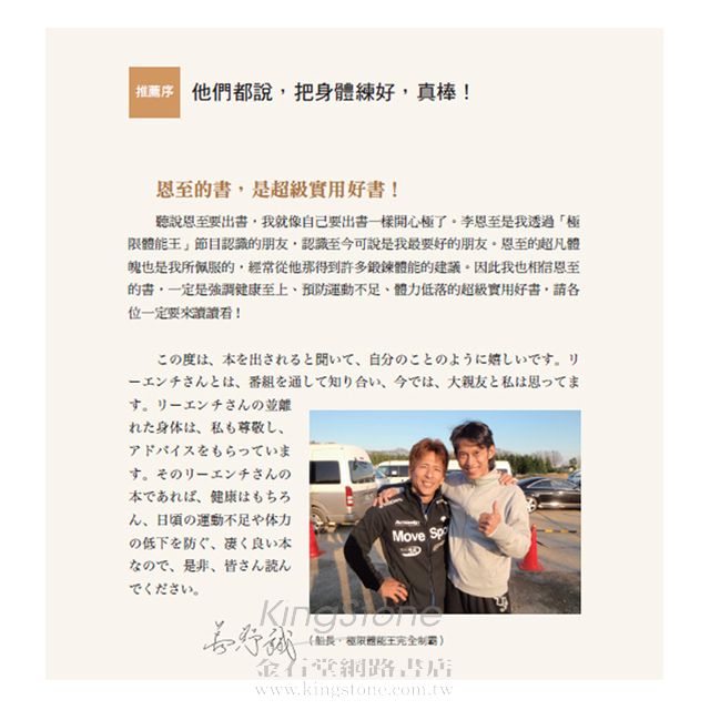 聽說恩至要出書,我就像自己要出書一樣開心極了。李恩至是我透過「極限體能王」節目認識的朋友,認識至今可說是我最要好的朋友。恩至的超凡體魄也是我所佩服的,經常從他那得到許多鍛鍊體能的建議。因此我也相信恩至的書,一定是強調健康至上、和預防運動不足、體力低落的超級實用好書,請各位一定要來讀讀看!